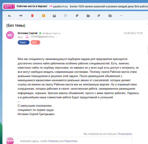 На сайте нашей газеты собраны лучшие предложения о работе как для работодателей, так и для соискателей. Частое обновление не позволит пропустить актуальные и свежие объявления о вакансиях в Кирове и области. Для удобства наших посетителей создана специальная база данных, в которой пользователь сможет найти подходящую именно ему вакансию по многим критериям, не посещая центра занятости. Для работодателей существует возможность разместить свои объявления и быстро подобрать хорошие и квалифицированные кадры в городе и области. Кроме того, на сайте размещены интересные статьи о работе. Здесь можно найти полезные советы по интересующим вас темам: как вести себя на собеседовании при приеме на работу или как добиться повышения в должности и зарплате. Работодателям также будут интересны данные публикации, так как мы предоставляем возможность размещать статьи о своей фирме или предприятии.