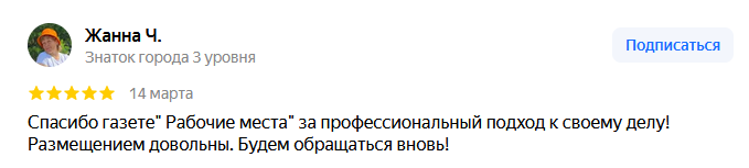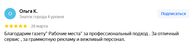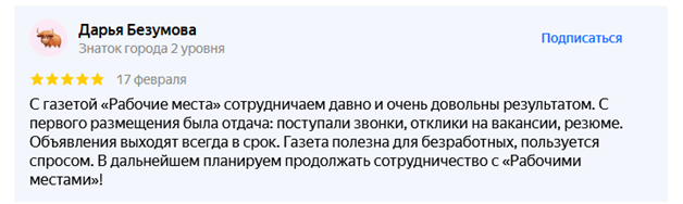 Большая часть отзывов соискателей наблюдается с интернет-ресурсов. Именно поэтому очень важно наличие у газеты востребованного официального сайта. А учитывая внимательность и оперативность персонала газеты «Рабочие места» сотрудничество становится не только результативным, но и приятным.
