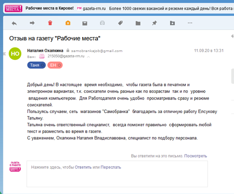 Хочу выразить благодарность за оперативную и четкую работу редакции "Рабочие места".