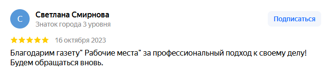 Мне очень нравится сотрудничать с газетой "Рабочие места". Менеджеры всегда вежливы, с ними приятно разговаривать.Объявления выходят вовремя.